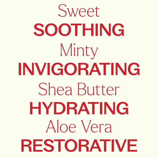 Aloe Barbadensis (Aloe Vera) Leaf Juice, Aqua (Water), Isopropyl Palmitate, Helianthus Annuus (Sunflower) Seed Oil, Glyceryl Stearate, Cetyl Alcohol, Mentha Piperita (Peppermint) Oil, Mentha Viridis (Spearmint) Leaf Oil, Vanilla Planifolia Fruit Tincture, Stearic Acid, Glycerin, Phenoxyethanol, Butyrospermum Parkii (Shea) Butter, Simmondsia Chinensis (Jojoba) Seed Oil, Panthenol, Xanthan Gum, Tocopheryl Acetate (Vitamin E), Camellia Sinensis (Green Tea) Leaf Extract, Ethylhexylglycerin