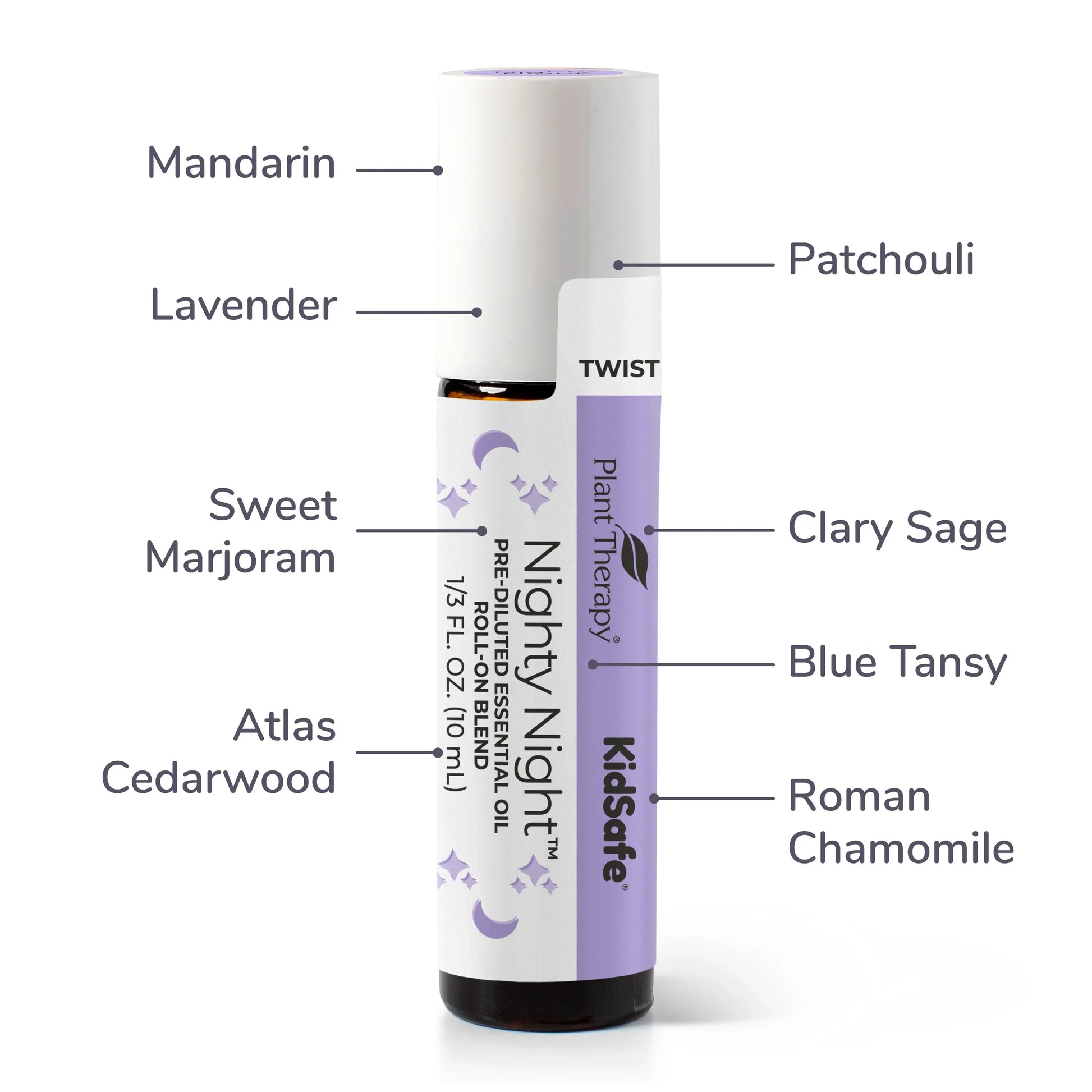 Nighty Night Roll-On: Caprylic/Capric Triglyceride (FCO), Lavandula Angustifolia (Lavender) Oil, Origanum Majorana (Sweet Marjoram) Flower/Leaf/Stem Oil, Citrus Nobilis (Green Mandarin) Peel Oil, Cedrus Atlantica (Atlas Cedarwood) Wood Oil, Pogostemon Cablin (Patchouli) Leaf Oil, Salvia Sclarea (Clary Sage) Oil, Anthemis Nobilis (Roman Chamomile) Flower Oil, Tanacetum Annuum (Blue Tansy) Flower Oil