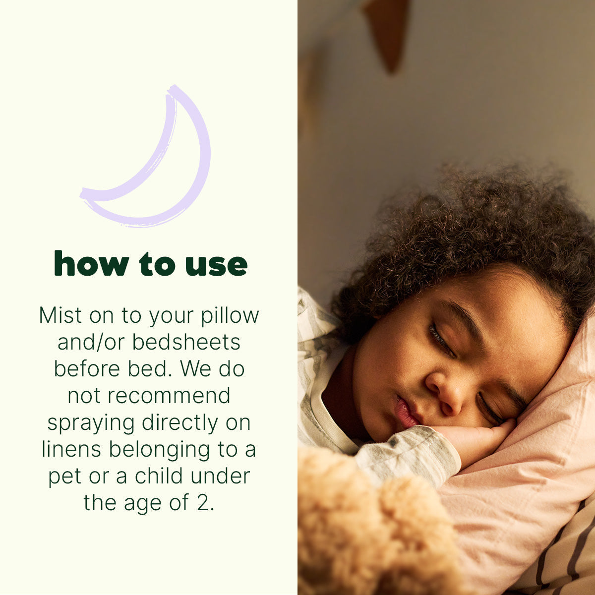 Mist on to your pillow and/or bedsheets before bed. We do not recommend spraying directly on linens belonging to a pet or a child under the age of 2.