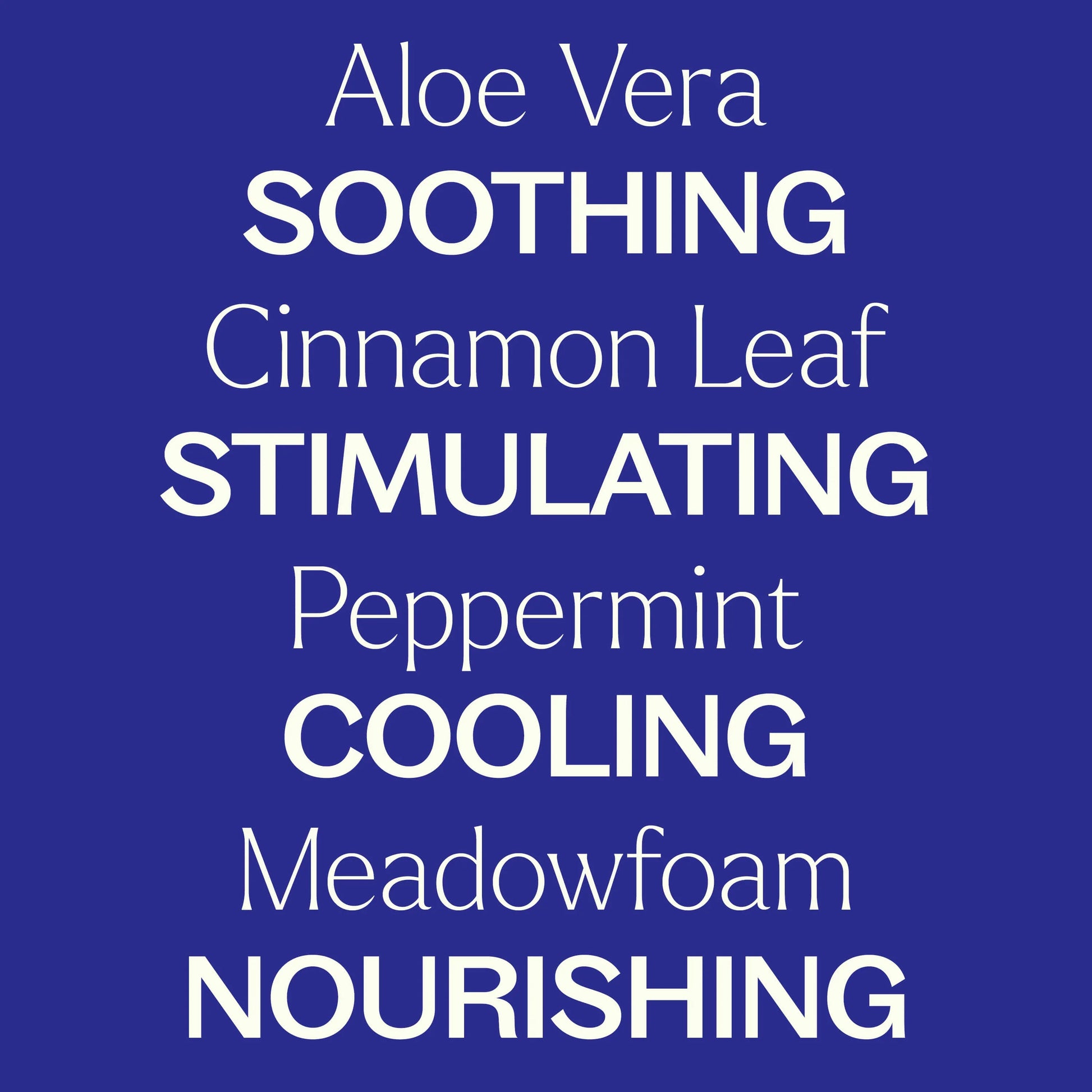 Aqua (Water), Aloe Barbadensis Leaf Juice, Limnanthes Alba (Meadowfoam) Seed Oil, Menthol Crystals, Capsicum Annuum Oleoresin, Cinnamomum Camphora (White Camphor) Bark Oil, Ocimum Basilicum (Basil) Oil, Piper Nigrum (Black Pepper) Fruit Oil, Anthemis Nobilis (Roman Chamomile) Flower Oil, Chamomilla Recutita (German Chamomile) Flower Oil, Cinnamomum Zeylanicum (Cinnamon) Leaf Oil, Cymbopogon Winterianus (Citronella) Leaf Oil, Eucalyptus Globulus Leaf Oil, Helichrysum Italicum Flower Oil, Zingiber Officinale (Ginger SD) Root Oil, Citrus Paridisi (Pink Grapefruit) Peel Oil, Juniperus Communis (Juniper Berry) Fruit Oil, Cymbopogon Flexuosus (Lemongrass) Leaf Oil, Mentha Piperita (Peppermint) Oil, Pinus Sylvestris (Pine) Needle Oil, Melaleuca Leucadendron Cajaput (Cajeput) Oil, Rosmarinus Officinalis (Rosemary) Leaf/Stem Oil, Mentha Viridis (Spearmint) Leaf Oil, Origanum Vulgare (Oregano) Oil, Glycerin, Hamamelis Virginiana (Witch Hazel) Water, Ethyl Alcohol, Phenoxyethanol, Carbomer, Triethanolamine, Tetrasodium Glutamate Diacetate