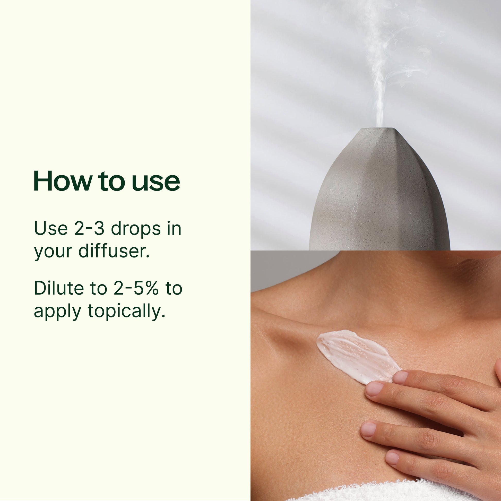 Aromatic: Diffuse using 2-3 drops per 100 mL of water or use in a personal inhaler.