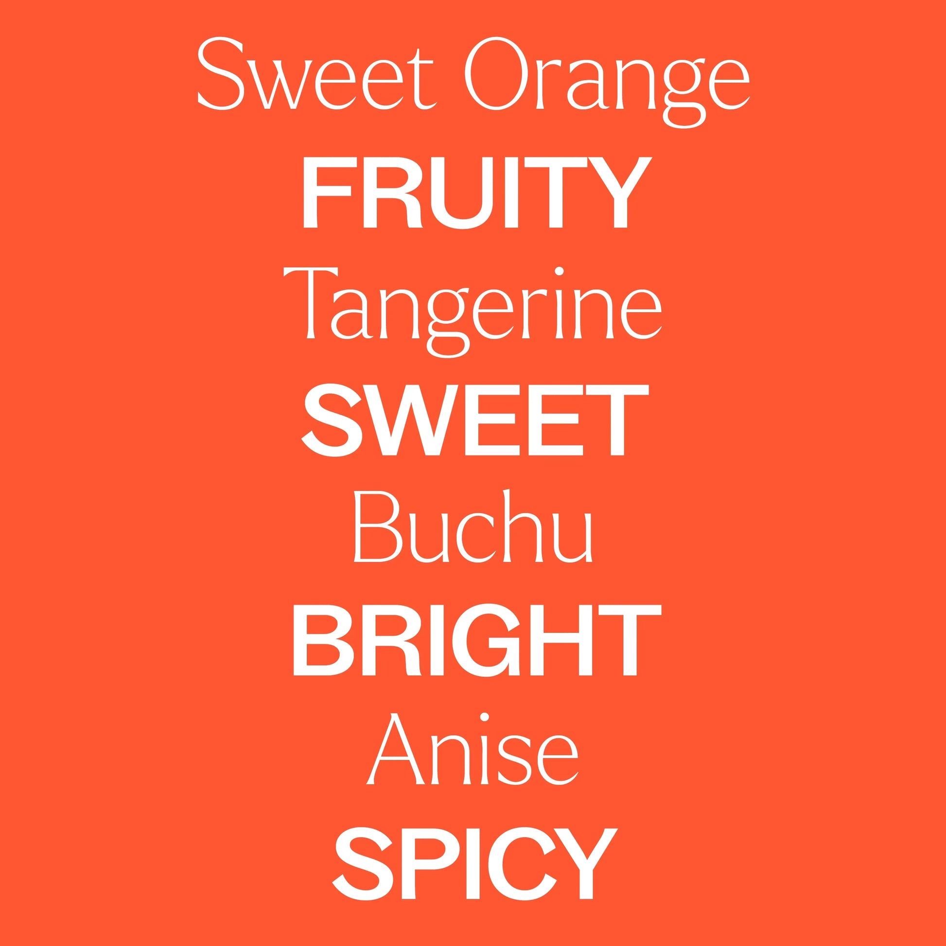 Citrus Aurantium Dulcis (Sweet Orange) Peel Oil, Citrus Nobilis (Red Mandarin) Peel Oil, Citrus Reticulata (Tangerine) Peel Oil, Myroxylon Pereirae (Balsam Peru) Oil, Illicium Verum (Anise) Fruit/Seed Oil, Prunus Amygdalus Amara (Bitter Almond) Kernel Oil, Barosma Betulina (Buchu) Leaf Oil